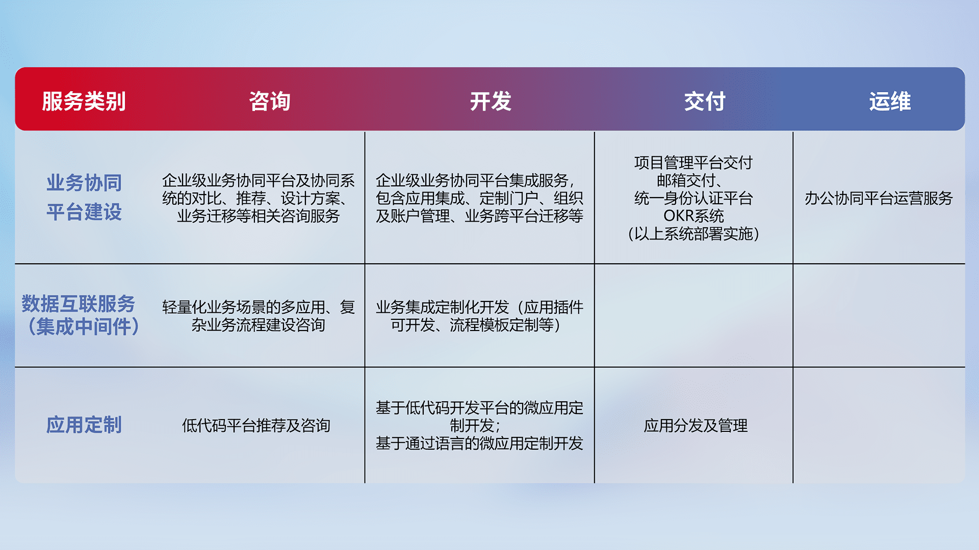 针对钉钉、、、企微、、、、IDaas等平台级产品提供产品的规划、、方案、、、、交付、、、、定制化开发等服务,,,实现如统一协同办公、、智能客户服务、、、、混合会议管理、、智能数据查询、、、、等业务场景,,,,实现数字化转型。。。。