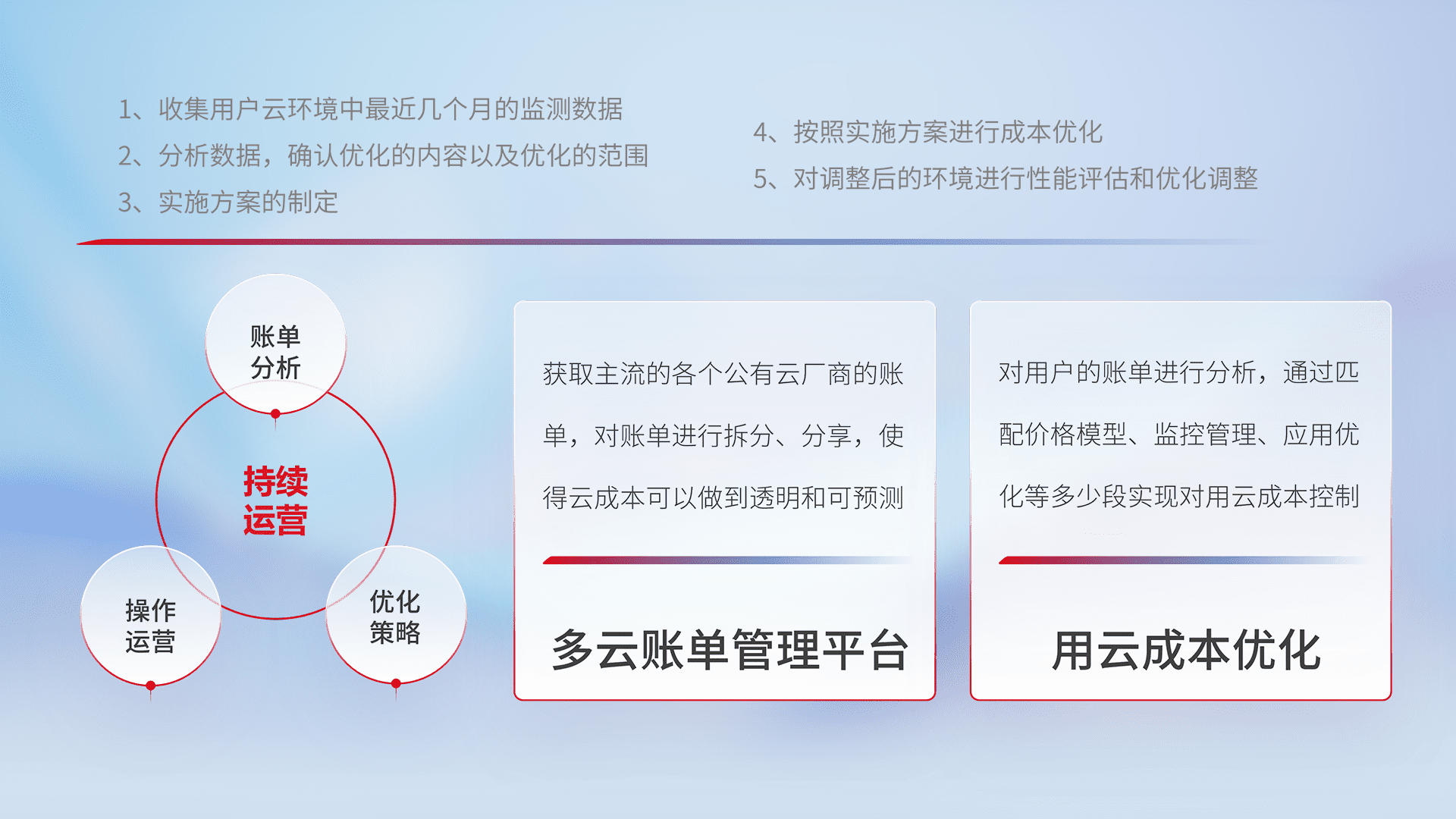 通过多云纳管,,,以统一的资源数据模型把客户的云资源进行抽象和封装,,,,进而实现对多云资源的统一操作,,保障云资源管理的可靠性、、稳定性与可用性。。量身定制化运维内容,,,配置、、、、开发运维、、补丁管理、、、备份、、、、监控、、认证和访问管理、、、审计和日常巡检等,,保障在用云过程中的可靠度,,,稳定度以及高可用率。。